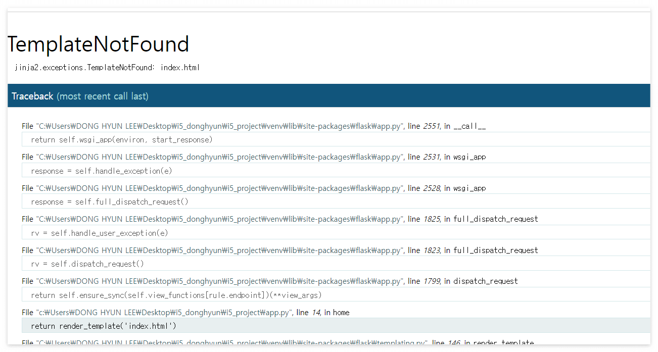 처음에 코딩 시작할 때 flask 쓸 거면서 templates 폴더 만들고 그 안에 index.html 넣는 과정을 망각했다.
