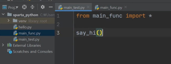 현재 열려 있는 main_test.py 파일에서는 간단하게 함수 이름만 톡톡 쓰면 함수가 들어간다.