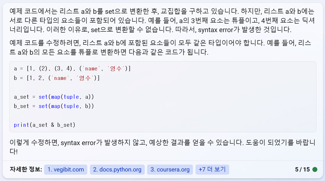 근데 이미 AI 대화 과정 중 절반은 답을 얻은 것 같다. set에 넣은 list의 eliments들은 type이 각각 중구난방이면 아무리 a셋과 b셋에 같은 공통되는 아이가 있어도 set 고유 연산을 처리할 수 없다.