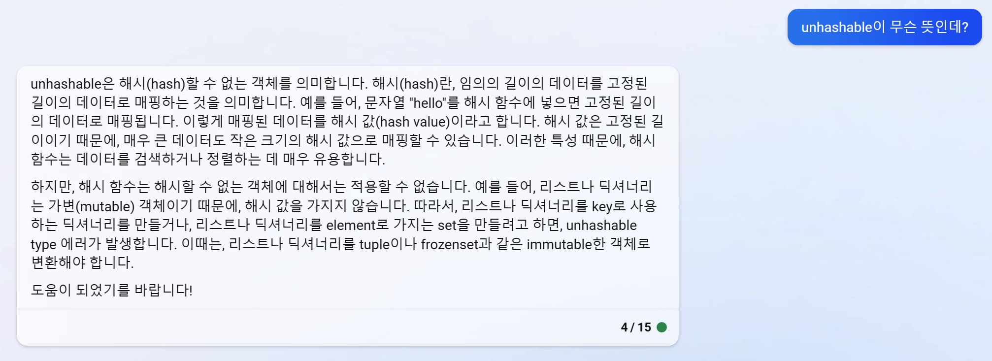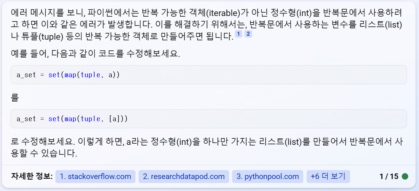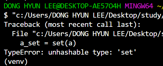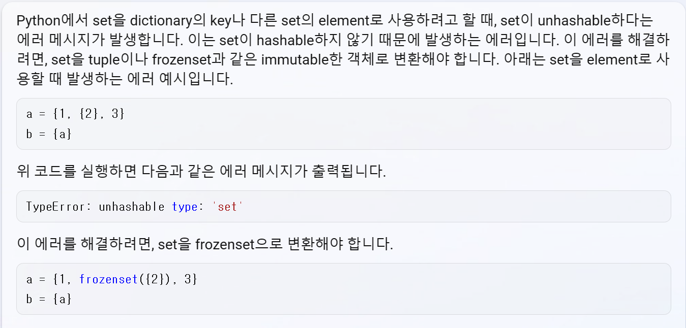 근데 이미 AI 대화 과정 중 절반은 답을 얻은 것 같다. set에 넣은 list의 eliments들은 type이 각각 중구난방이면 아무리 a셋과 b셋에 같은 공통되는 아이가 있어도 set 고유 연산을 처리할 수 없다.