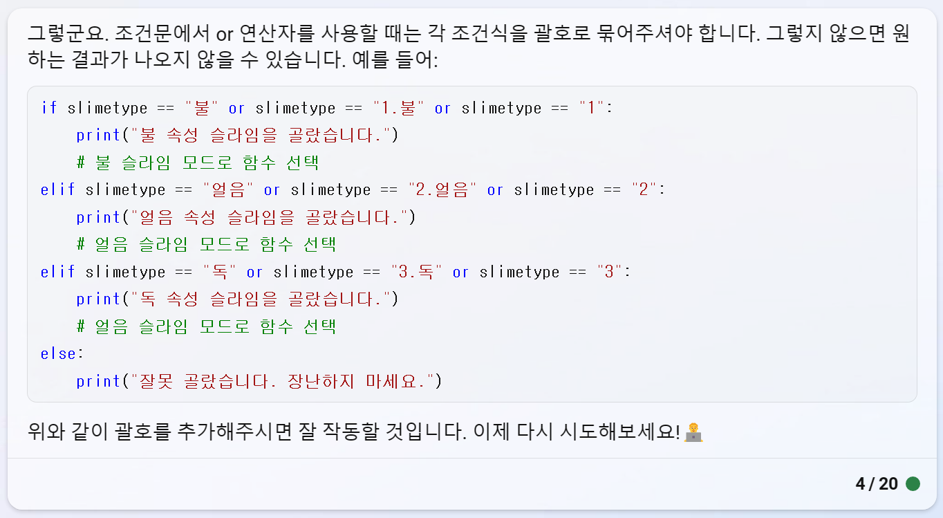 간단하게 대답하는 걸 대비해서 여러 답안의 가능성을 열어주고 싶었다. 그래서 if 문과 elif 문에서 slimetype 값을 검증할 때 or 을 사용해 여러 선택지를 감안해 보려고 했는데, 위에 처럼 코딩하면