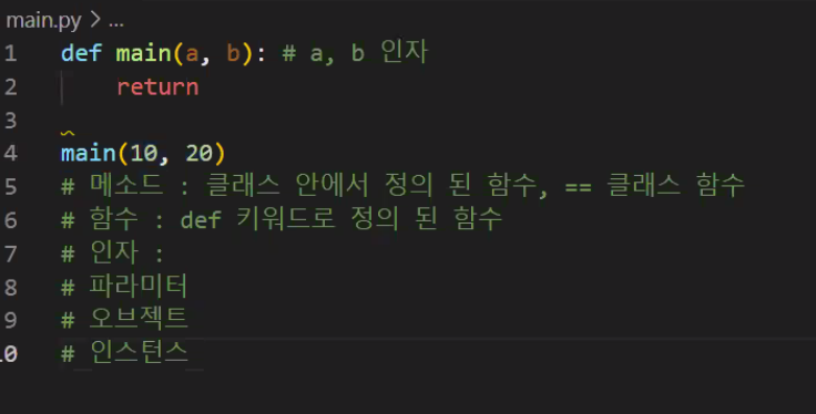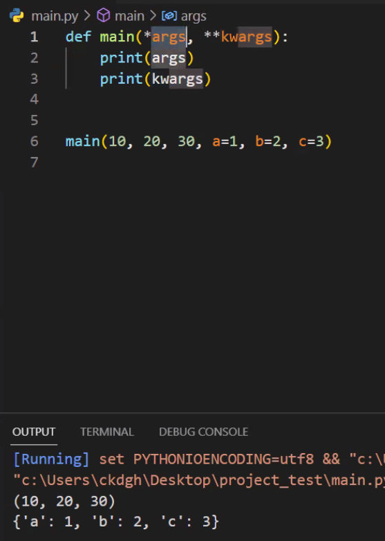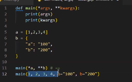 _아래 main( )두줄 코드는 같다. 즉, *은 리스트의 양쪽 괄호는 벗기는 거고, **는 딕셔너리의 괄호를 벗기는거다.