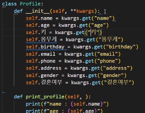 _받아야 하는 인자가 여러개일 때, **kwargs로 받고, 줄때 파라미터에서 값을 하나하나 정해준다.