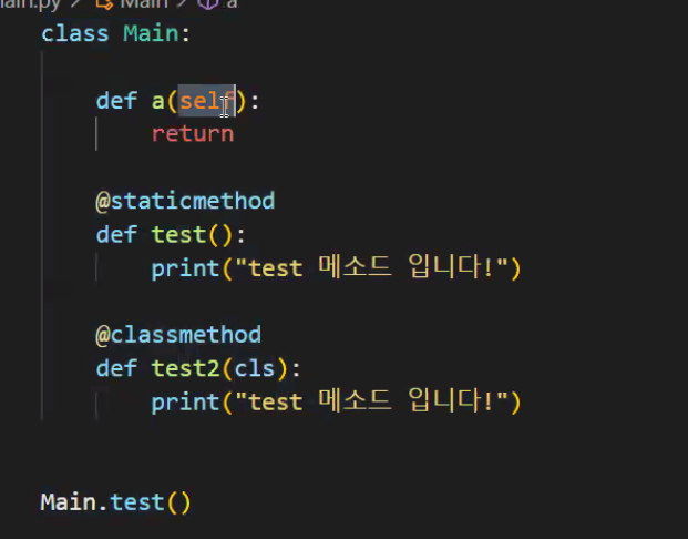 @staticmethod 라는 데코레이터를 붙이면 돌아간다. 아래꺼는 class를 인자로 받음