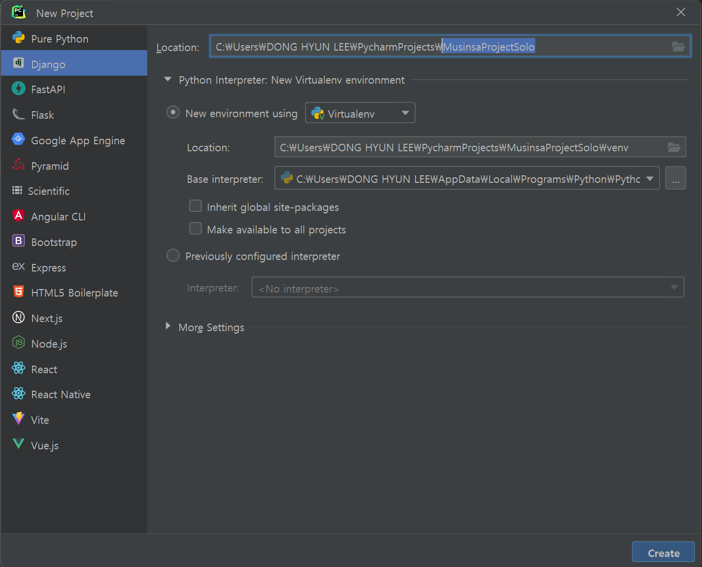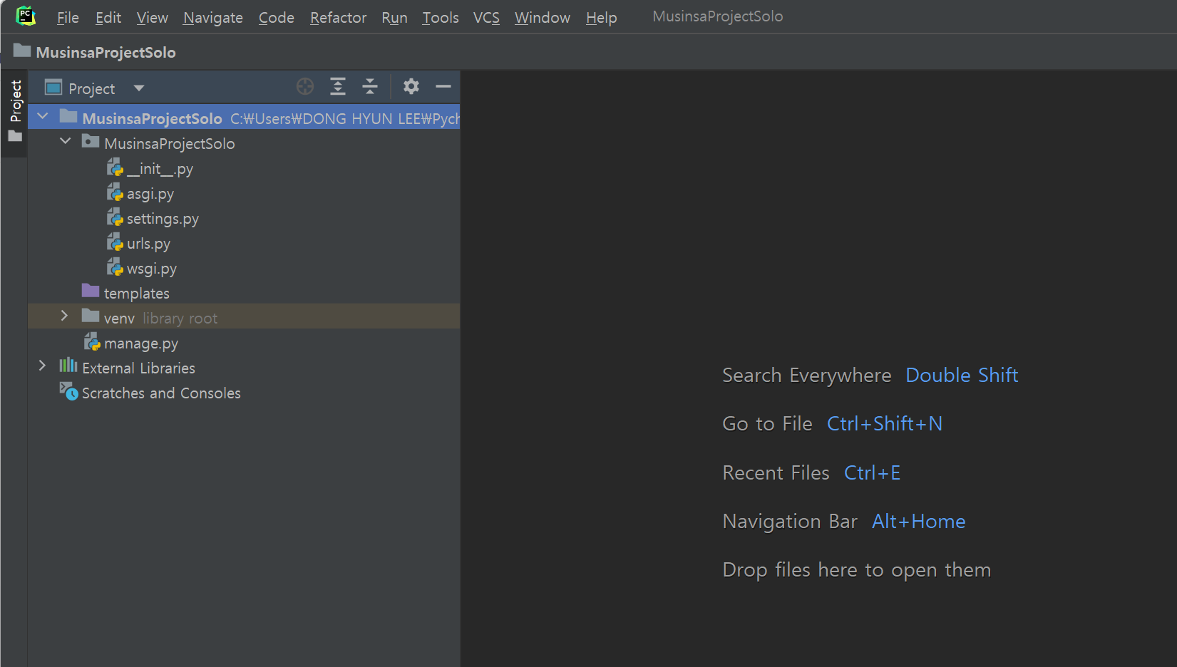 동일한 MusinsaProjectSolo 이름 폴더가 하나 더 있는데, 이게 메인이 되는 project의 기본앱이다.