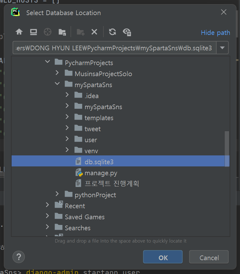 아까 경로 맨 마지막에 입력했던 이름 대로 새로운 Django project 폴더가 생성되었고,