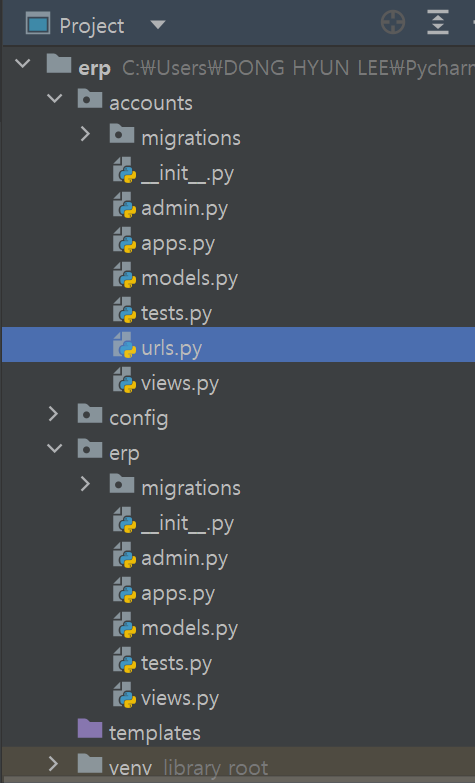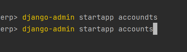 3. 앱 2개 만들기! 각각 accounts와 erp가 된다.