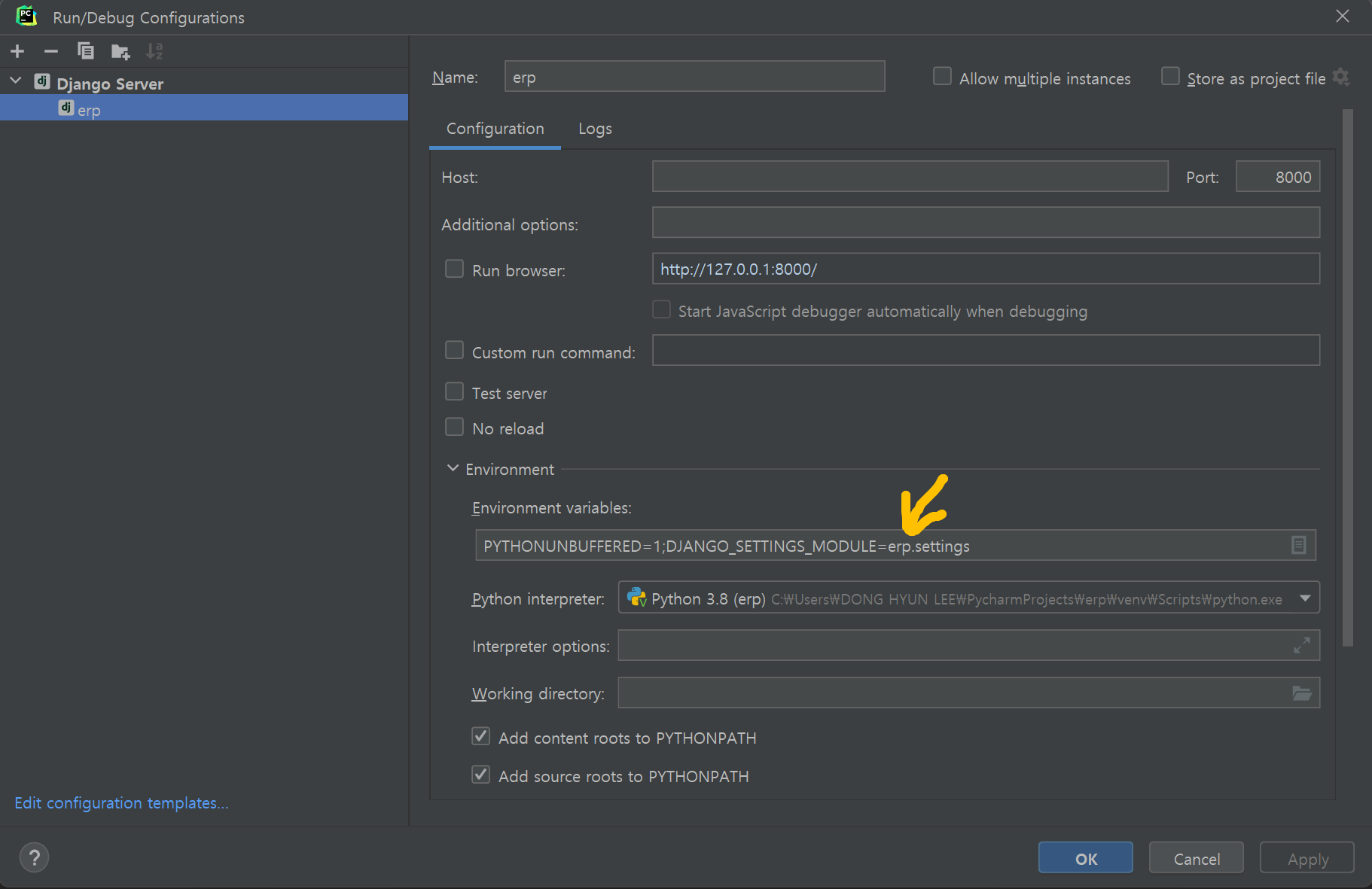 그래서 그 파이참 설정도 이전 erp를 가리키고 있으니, 수정해야 한다.