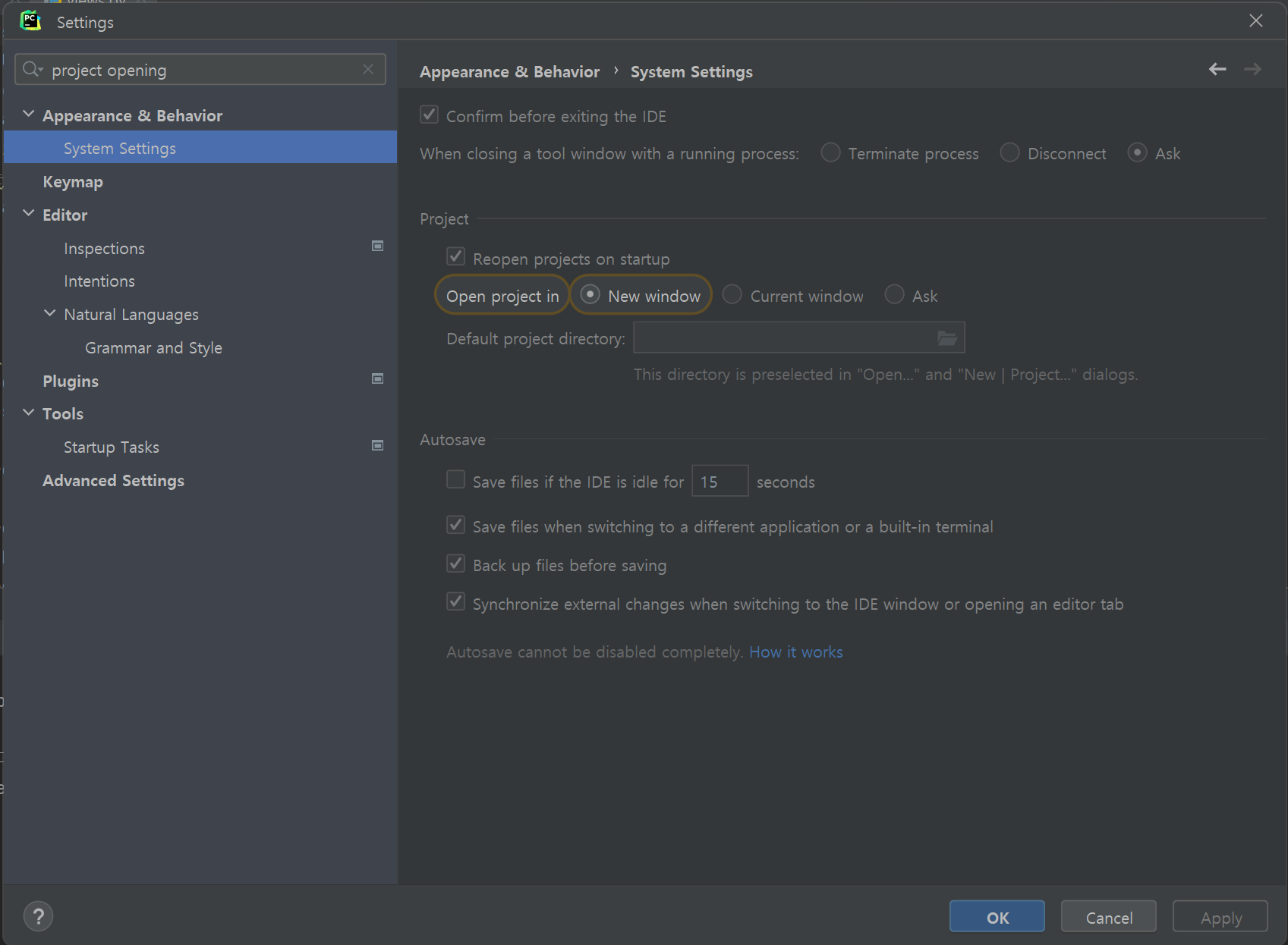 내용 중에 Open project in 옵션에서 선택할 수 있는 것들이 있다.