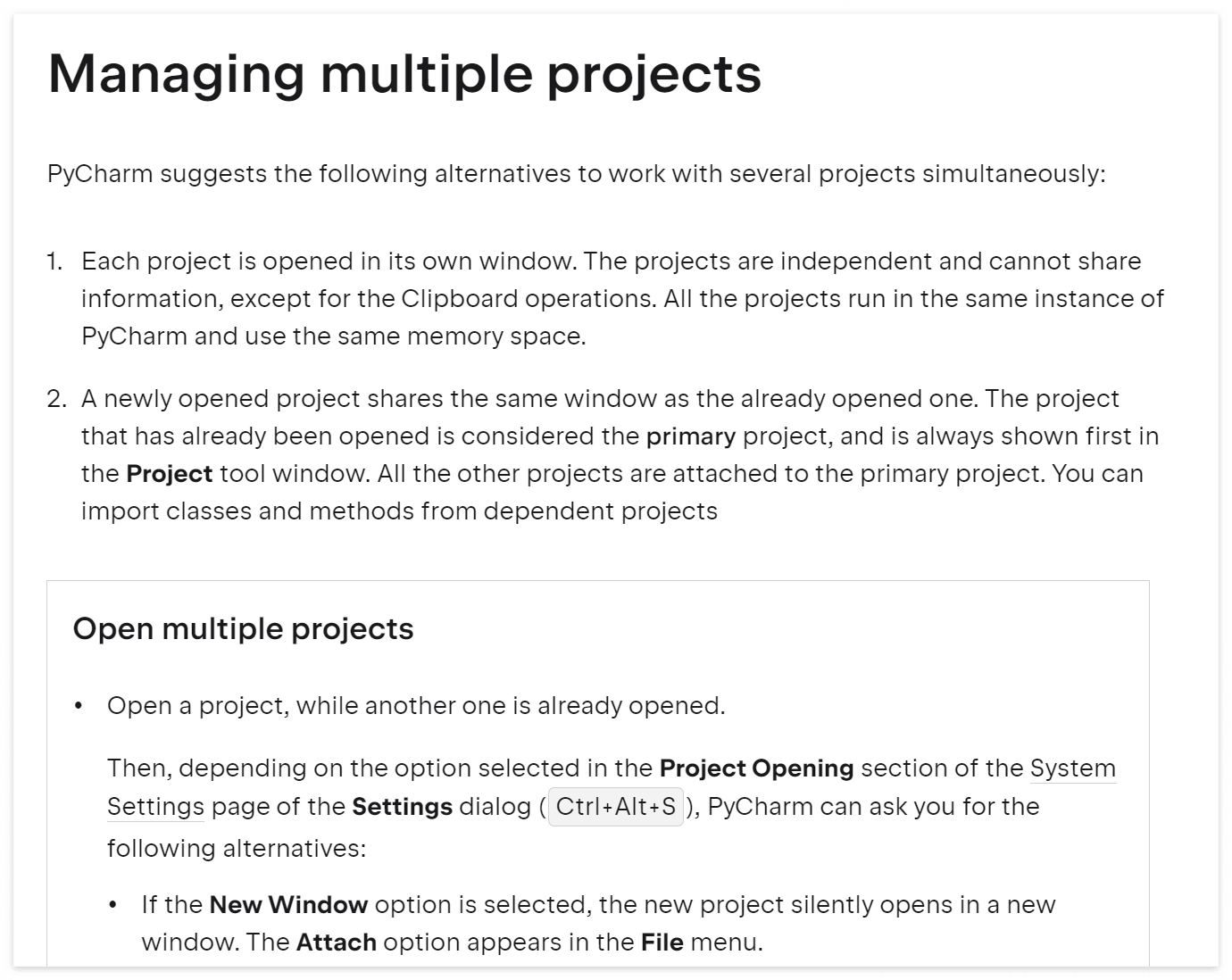 파이참 공식문서에 가서 검색 : https://www.jetbrains.com/help/pycharm/2023.1/open-projects.html