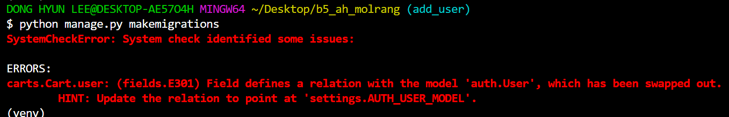 에러메시지에서 언급되고 있는 carts앱은 장바구니에 대한 모델인데, 뭔가 그 쪽에서 user 모델을 참조하고 있는게 있는 것 같았다.