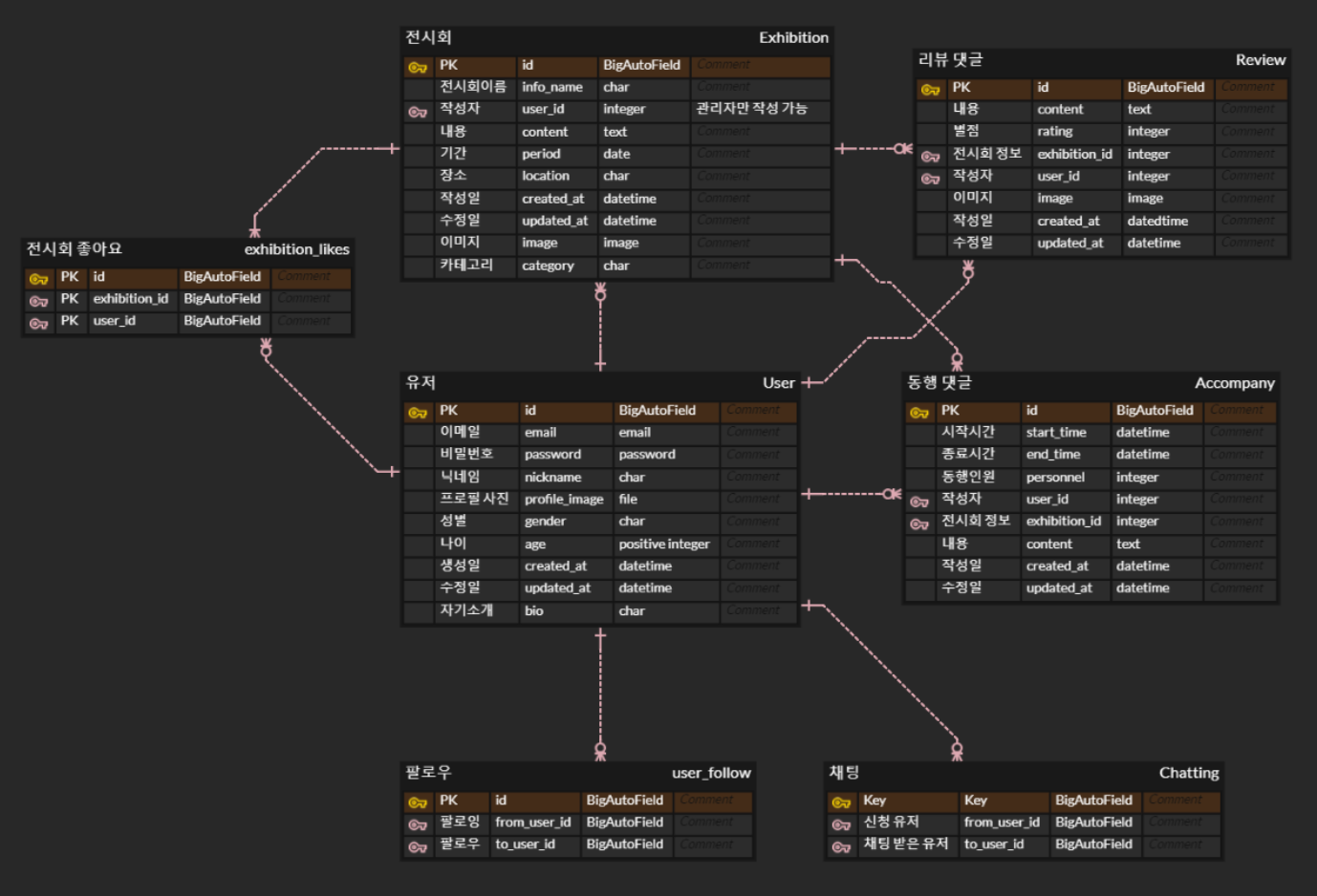 이용자는 전시에 대해 좋아요, 리뷰를 남길 수 있으며 함께 전시에 갈 동행 희망자를 구하는 모집글을 남길 수 있다.