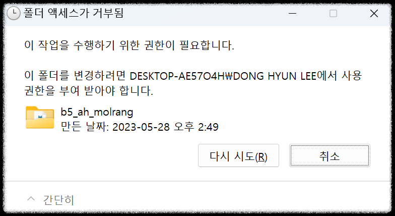 폴더 삭제 문제를 해결하려면, 관리자 권한으로 PowerShell을 실행하여 해당 폴더에 대한 권한을 변경해야 합니다. 다음 단계를 따라 실행해 보세요.