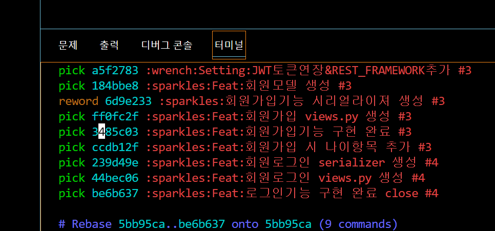 내가 reword로 바꾼 모든 커밋들의 커밋메시지 에디터 화면으로 진입한다.